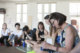 Club of Im_Possibilities. Teilnehmende macht Notizen. Weitere Teilnehmende (Hintergrund) geben das Rosenöl weiter